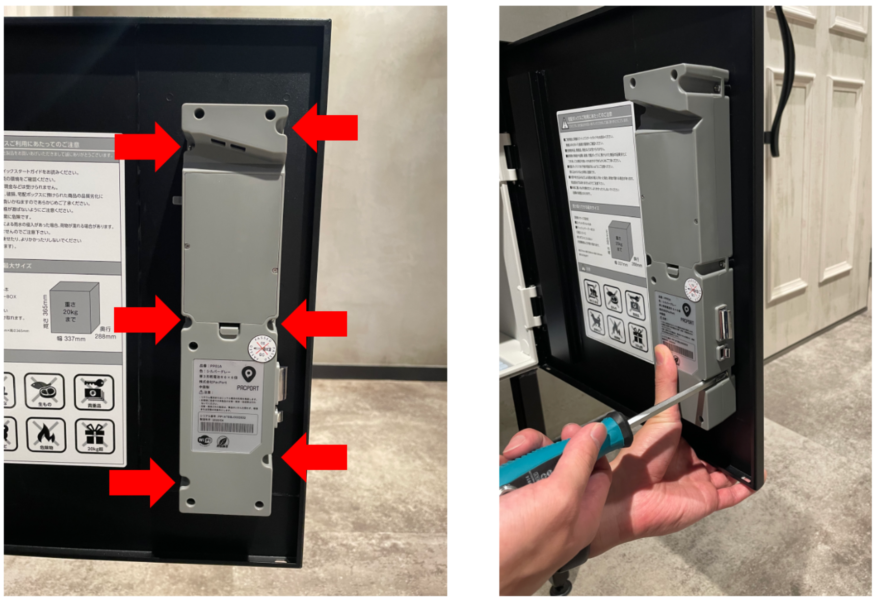 PacPortのロックデバイス部品は、宅配ボックスの扉を開け、ロックデバイス裏側の6箇所(下図赤矢印部分)にてネジ固定されております。
