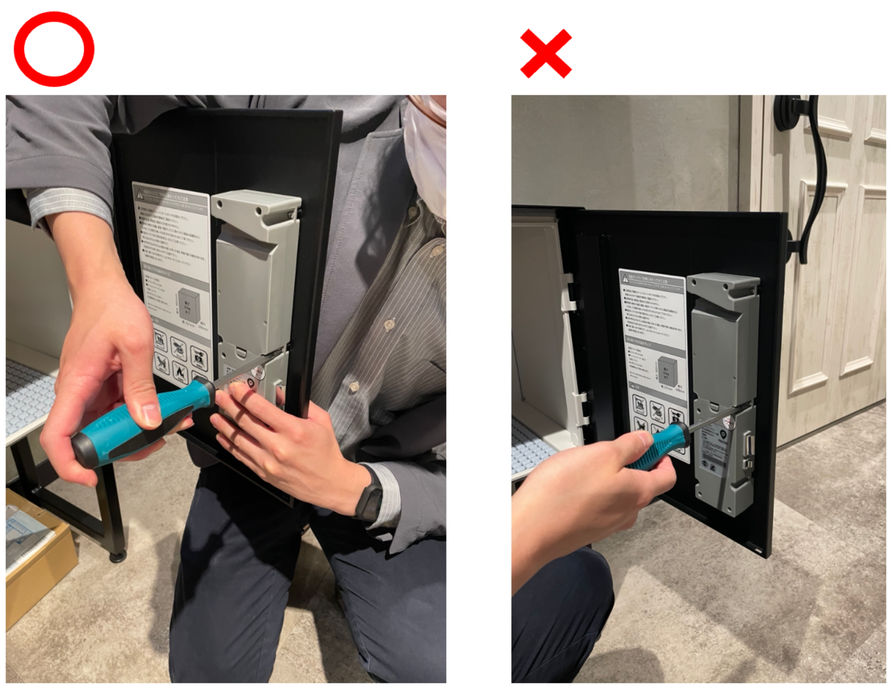ネジ止めの際に、扉側に荷重がかかるため、以下「○」図のように、扉側をおさえ、ロックデバイス下部を手で押さえながらネジ止めを行ってください。