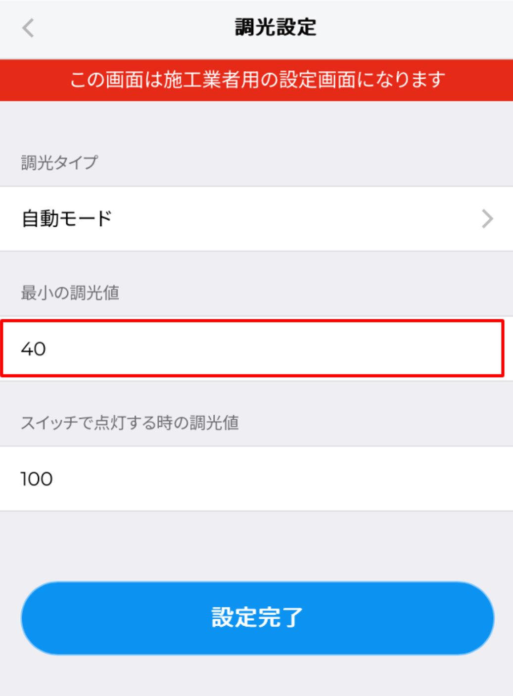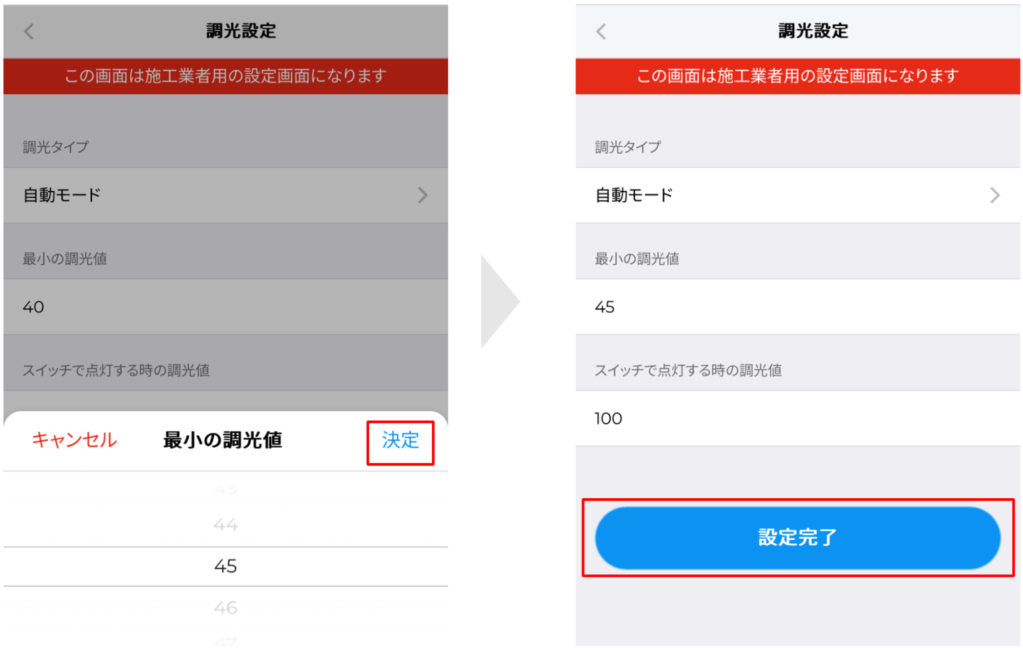 3. 現状設定してある「最小の調光値」より大きい数値を設定の上、「決定」をタップし、「設定完了」をタップします。