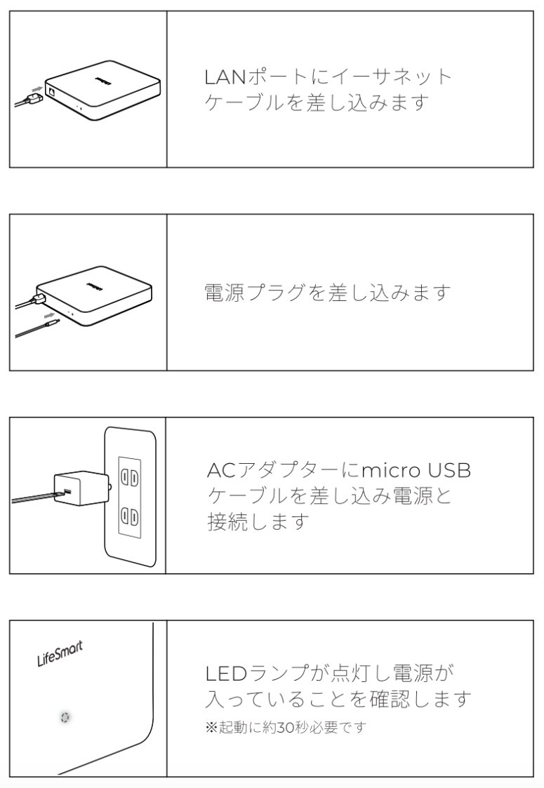 設置については、以下の図に従い、電源・ケーブルを接続してください。その後、アプリでペアリングします。