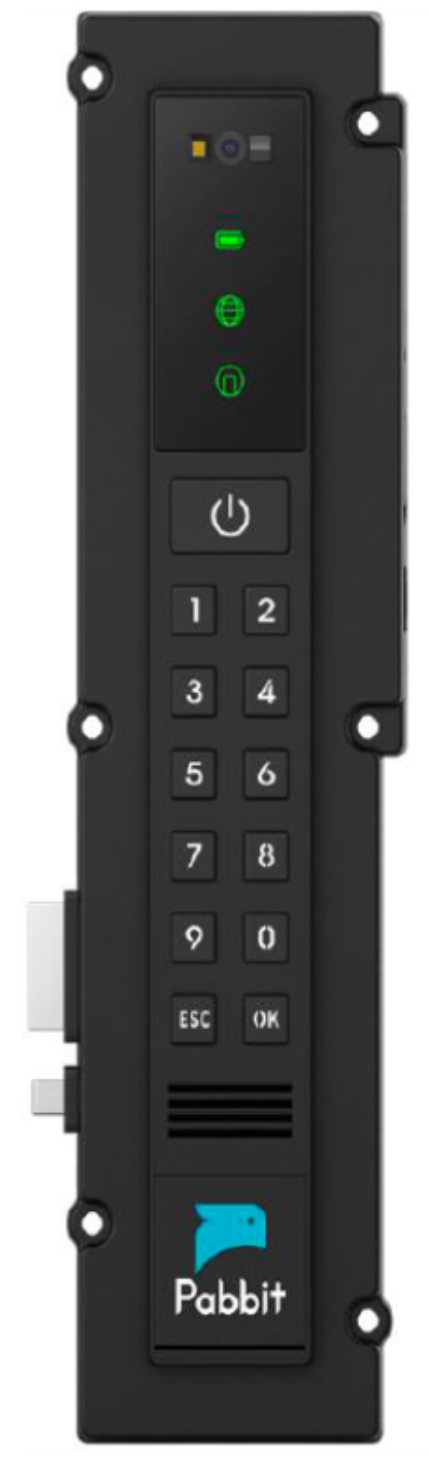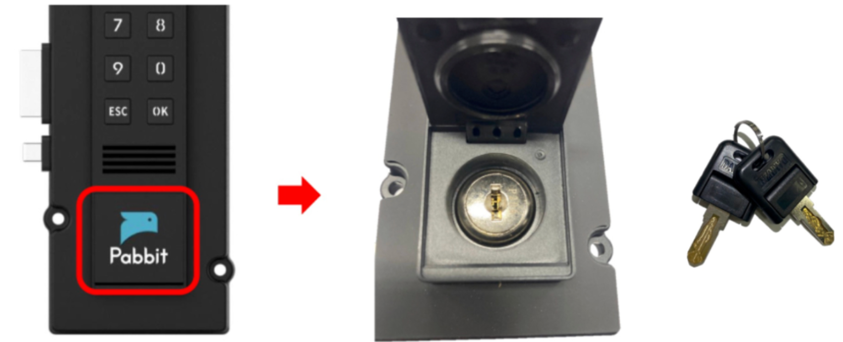 テンキーデバイス下部に「Pabbit」というマークが記載されているパネルがあります。パネルの下に隙間があるので、そこに指をかけて上に引き上げると、鍵穴がございますので、この鍵穴にバックアップキーを挿入いただき回転することで、解錠することができます。
