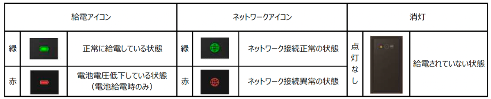 ※いずれのマークも消灯している場合は、給電されていないため、電池に絶縁シートが挟まっている、あるいは電池切れをおこしている可能性がありますので、給電状態についてご確認ください。