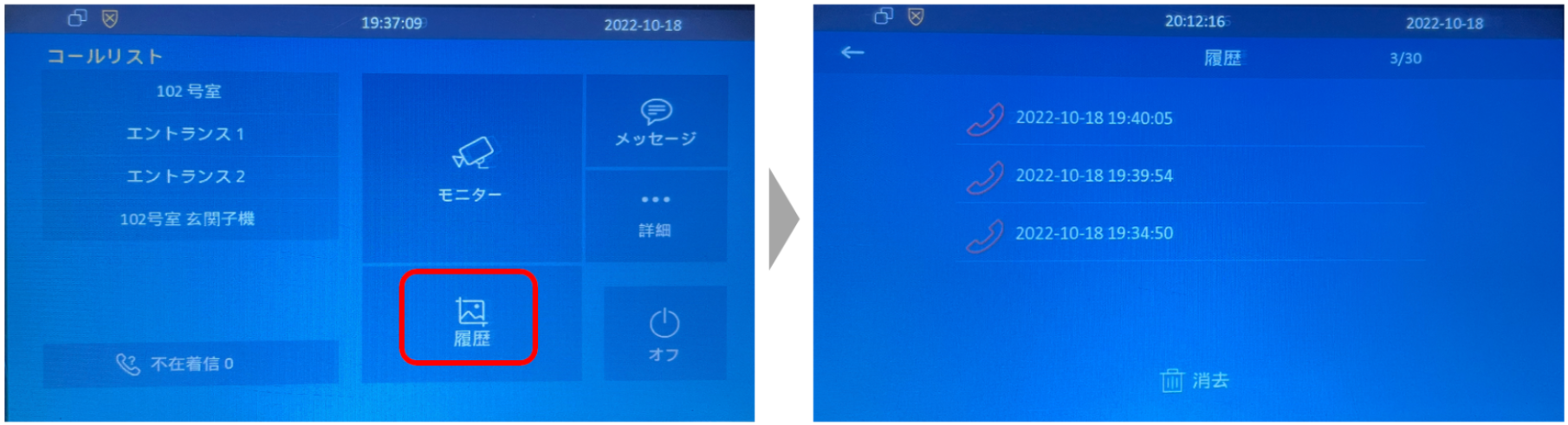 「履歴」アイコンをタップで、インターホンの呼び出し履歴を参照することができます。履歴画面で、対象の日時項目をタップすると、対象日時にキャプチャされたカメラ画像を見ることができます。