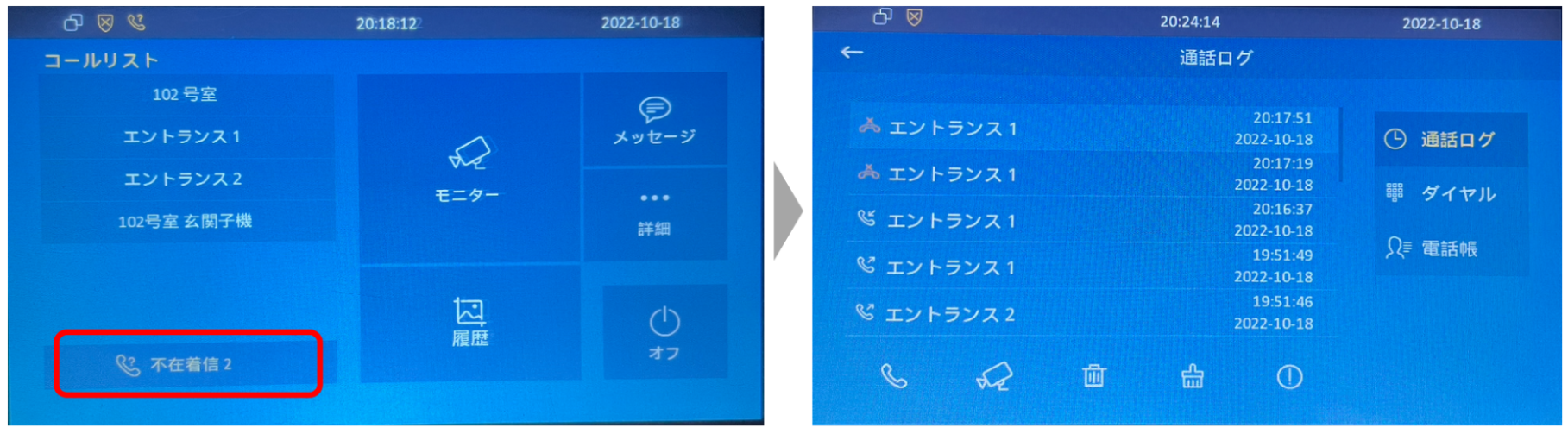 インターホンの呼び出しがあるも、応答できなかった場合、「不在着信」に件数が表記されます。「不在着信」をタップで、応答したもの、応答できなかったもの、すべての呼び出しログを見ることができます。