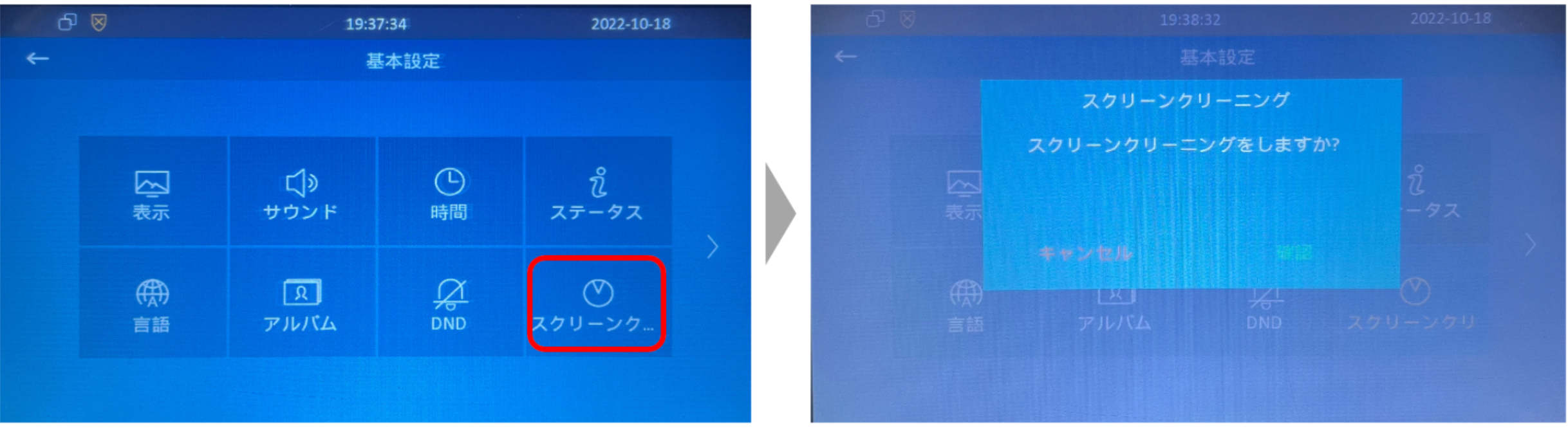 「スクリーンクリーニングをしますか?」というポップアップが表示され、「確認」をタップすると、30秒間画面操作が無効になります(画面上では30秒間のカウントダウンが表示されます)。