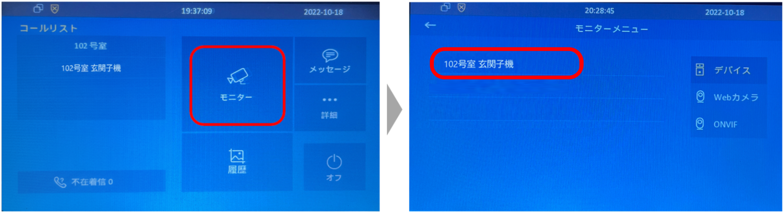 「モニター」アイコンをタップし、玄関子機の項目をタップすることで、玄関子機のライブビューを見ることができます。