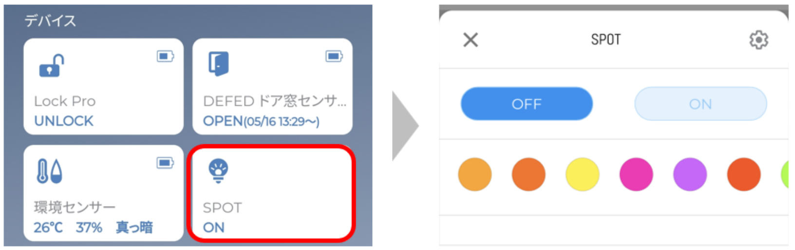 SPOTのライトは、スマートホーム画面の「SPOT」のパネルより、ON、OFF、点灯色変更の操作することができます。