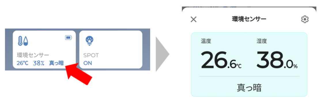 スマートホームトップ、デバイス欄内に、環境センサーの情報がパネル表示されます。パネルをタップすることで、センシング結果を拡大表示します。