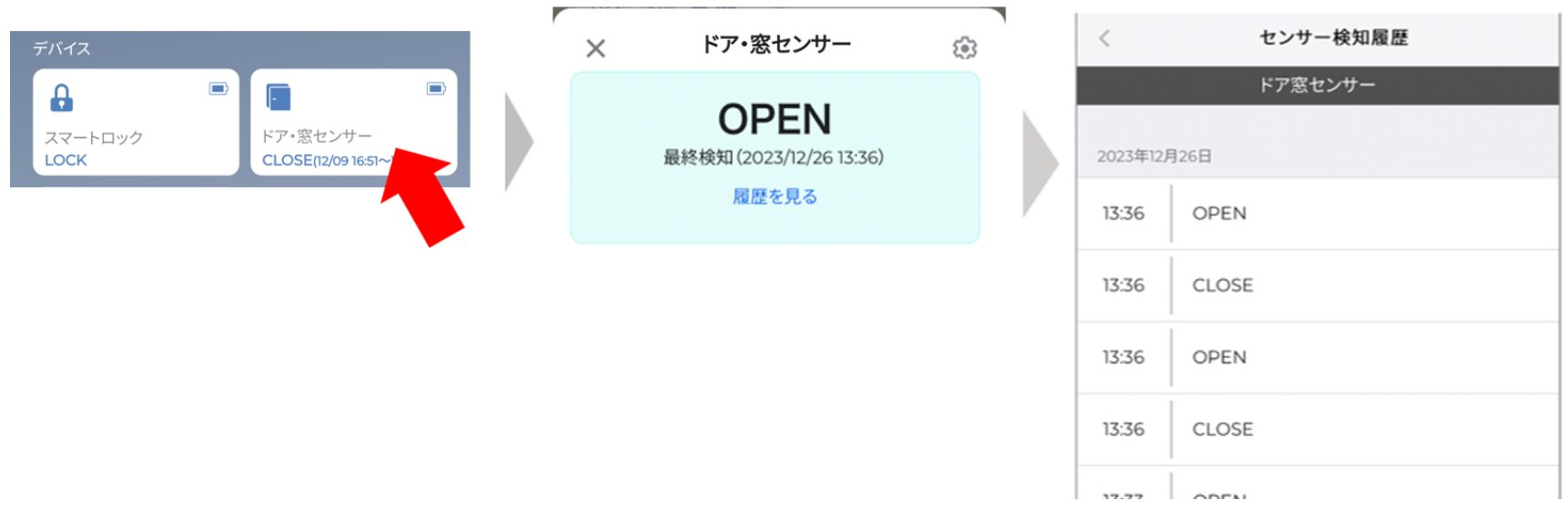 ドア開閉の最終検知情報は、スマートホームトップ デバイス欄内のパネルに表示されます。