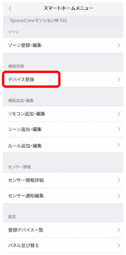 アプリから家電をコントロールするデバイスやセンサーは、アプリよりデバイス登録することで利用可能となります。機器登録は【デバイス登録】画面から行います。