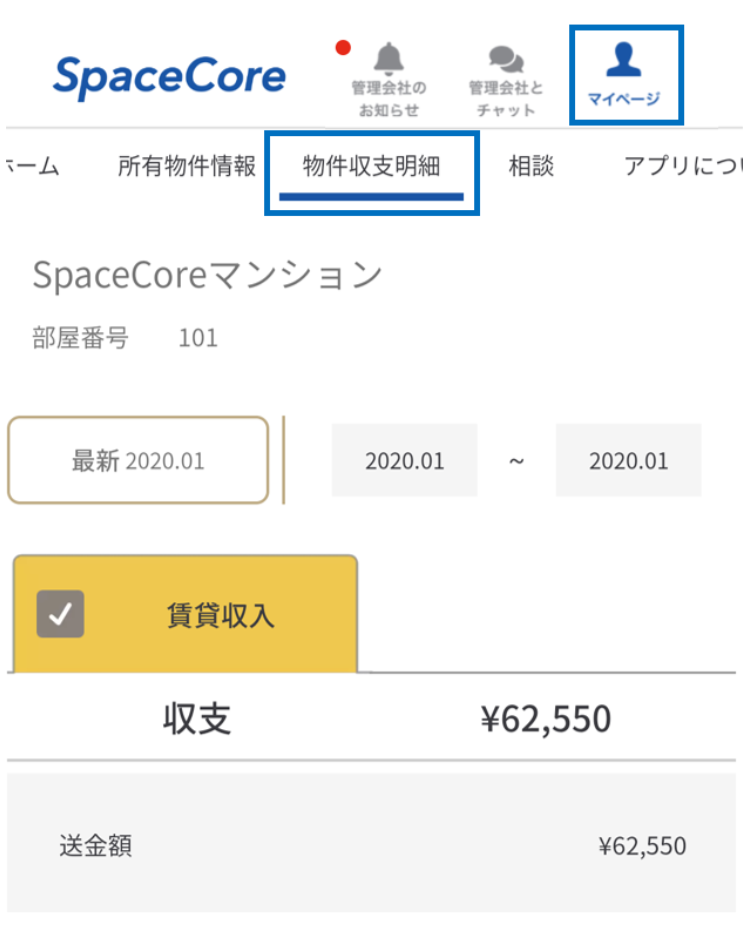 ご利用になるには、画面上部の[マイページ] > 画面上部メニューの[物件収支明細]タブをタップしてください。