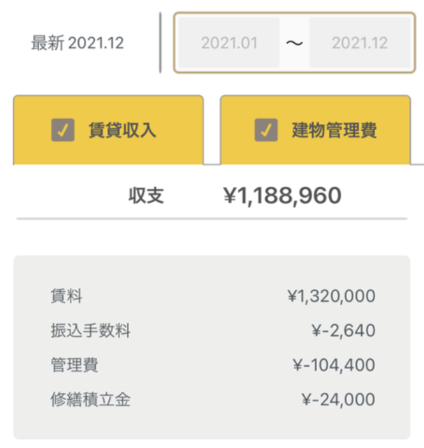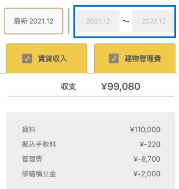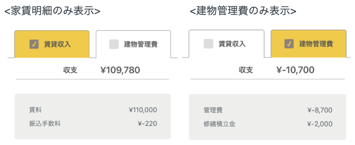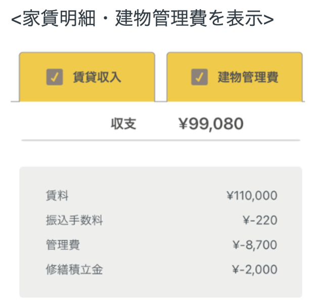 物件収支明細機能では、[賃貸収入]と、[建物管理費]を確認することができます。