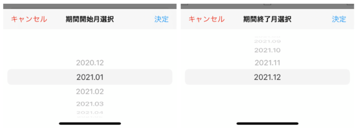 [期間開始月選択][期間終了月選択]で年月を選択し、[決定]をタップすると、選択した期間の金額・収支を集計し表示します。