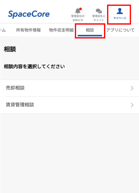 ①[マイページ]>[相談]タブで、[賃貸管理相談]をタップします。