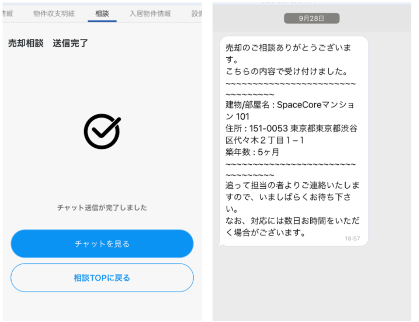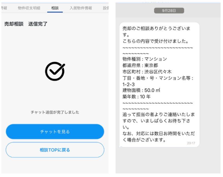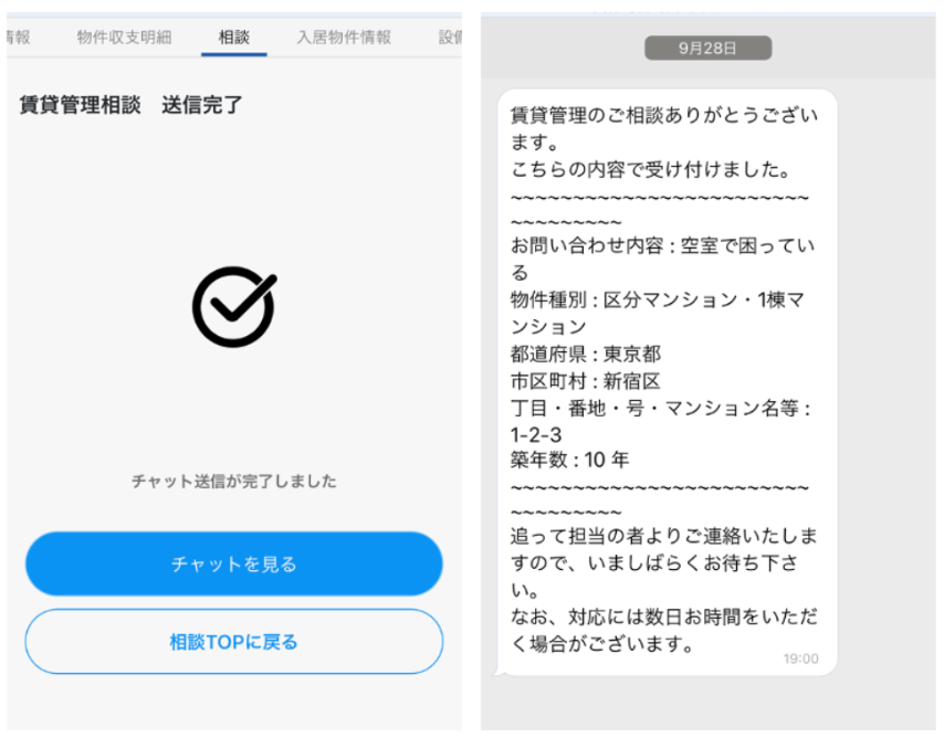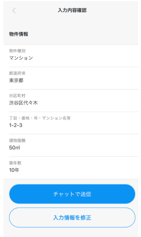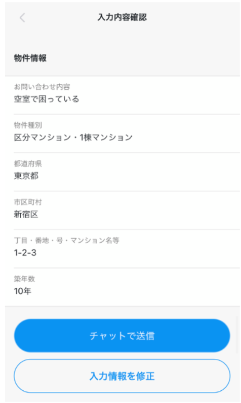④入力内容に問題なければ、[チャットで送信する]ボタンをタップしてください。物件の情報が管理会社に送信されます。