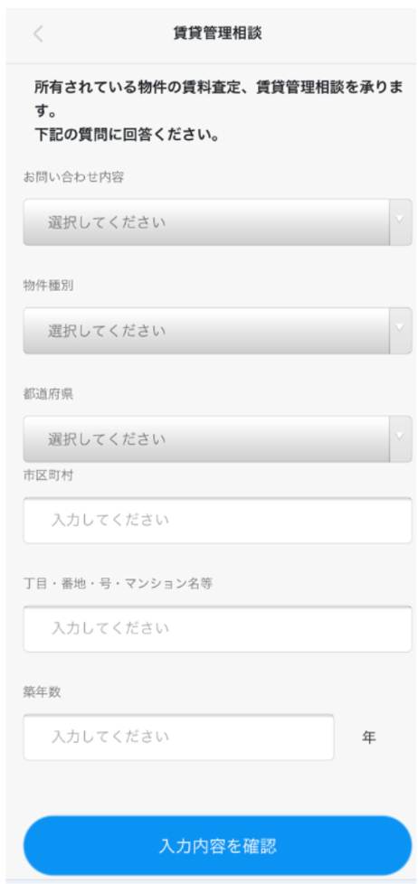 ②[お問い合わせ内容]及び、お問い合わせいただく物件の情報を入力し、[入力内容を確認]をタップして下さい。