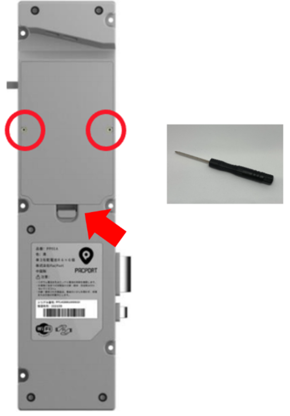 宅配ボックスを開け、デバイス背面の電池カバー左右の小ネジを、付属ドライバー(または市販の精密ドライバー)で外し、爪を下から上に持ち上げてカバーを外して、電池を交換ください。