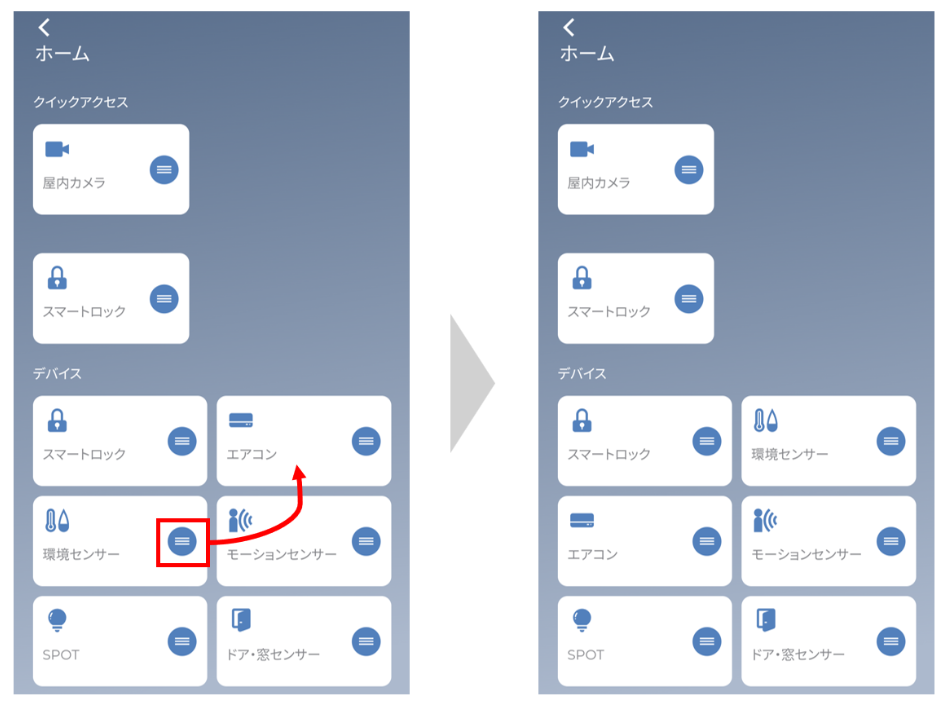 スマートホーム画面に表示される、デバイスやリモコンパネルの表示順は任意で変更することができます。
