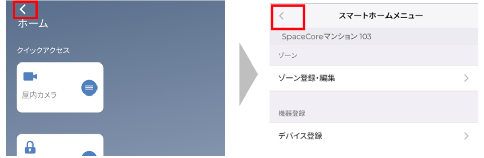 4. 並び順の変更が完了したら、画面左上の戻るボタン[<]をタップします。その後、ホームホームメニューにて再度画面左上の戻るボタン[<]をタップし、スマートホームトップ画面に戻ります。
