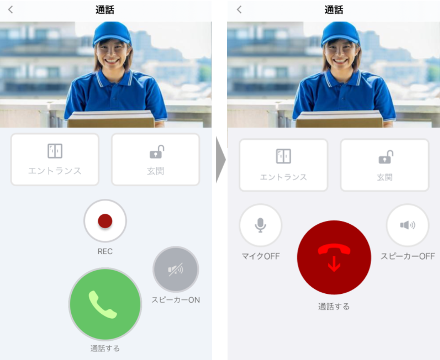 ③「通話」画面にて、緑色の「通話する」ボタンが表示されている状態は、リアルタイムでカメラ映像と室外の音声が確認できる状態で、通話ができる状態になっていません。会話をするにはさらに「通話する」ボタンを押してください。