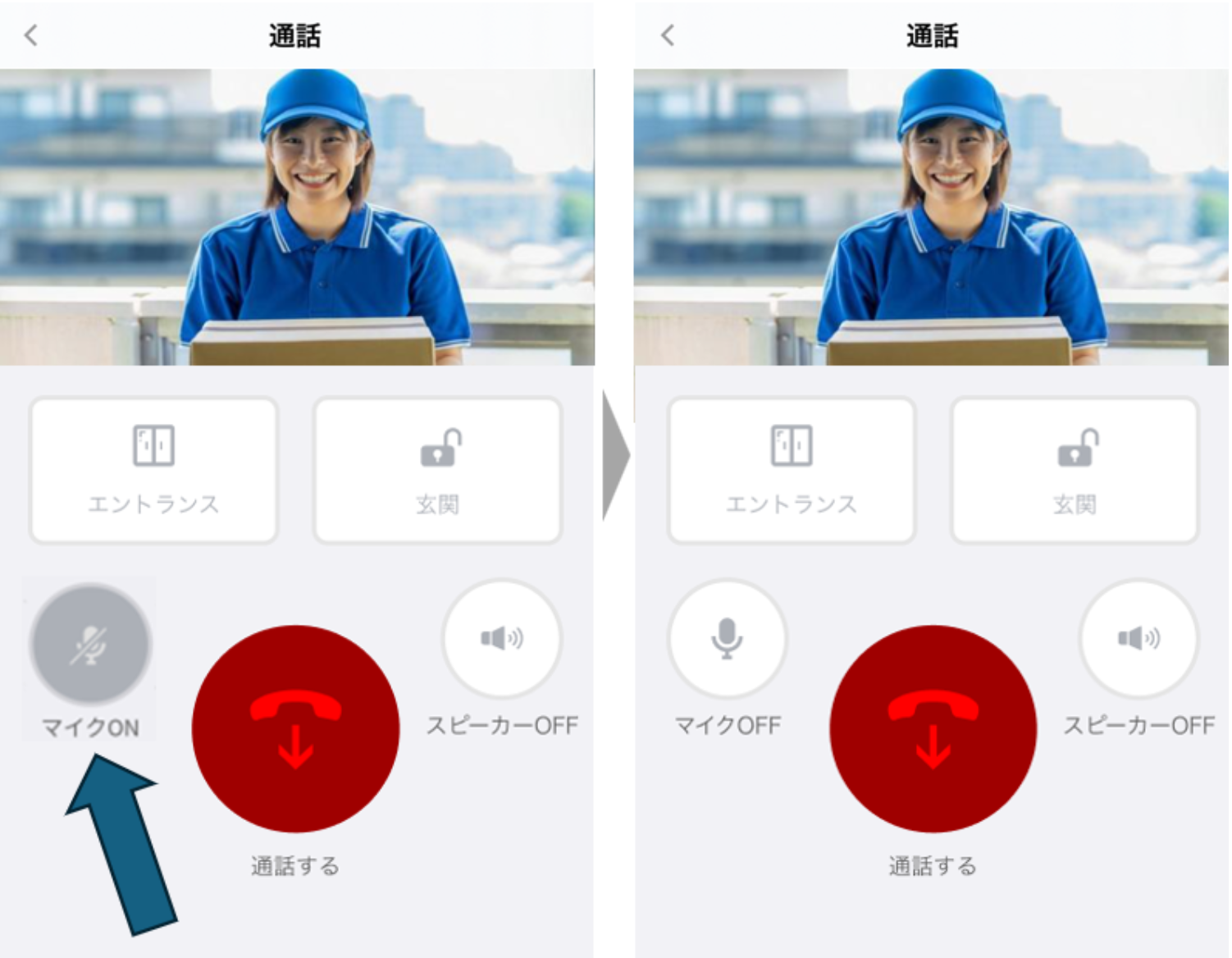 ④室外子機側に、アプリ側の音声が届いていない場合には、アプリの通話画面で、マイクオフになっていないかどうか(濃いグレーで「マイクON」と表示されている状態が、マイクオフの状態です)ご確認ください。