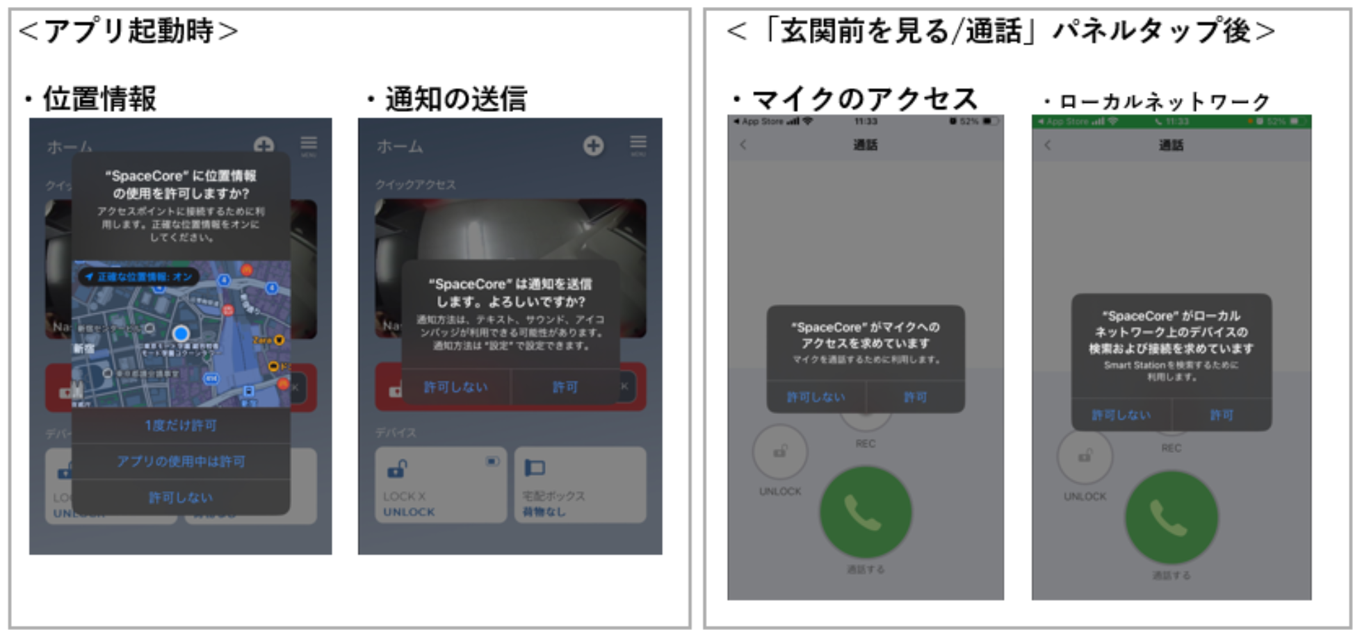 初めてSpaceCoreアプリにてNasta Interphone ALを操作されるスマートフォン端末においては、端末側で、SpaceCoreアプリに対しNasta Interphone ALを操作するために必要な設定が許可されていない可能性があります。
