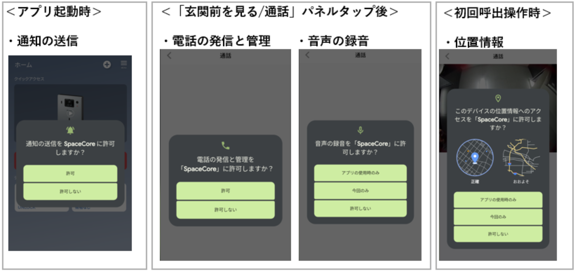 SpaceCoreアプリを起動し、起動時の各種ポップアップ、および、スマートホームタブの「スマートインターホン」をタップ>「玄関前を見る/通話」パネルをタップして表示されるポップアップすべてOKをタップしてください。一度拒否をしてしまった等で、ポップアップされない場合には、アプリを一度アンインストール後、再度インストールし直し、再度アプリログインの上、すべてのポップアップに対し許可の操作を実施ください。