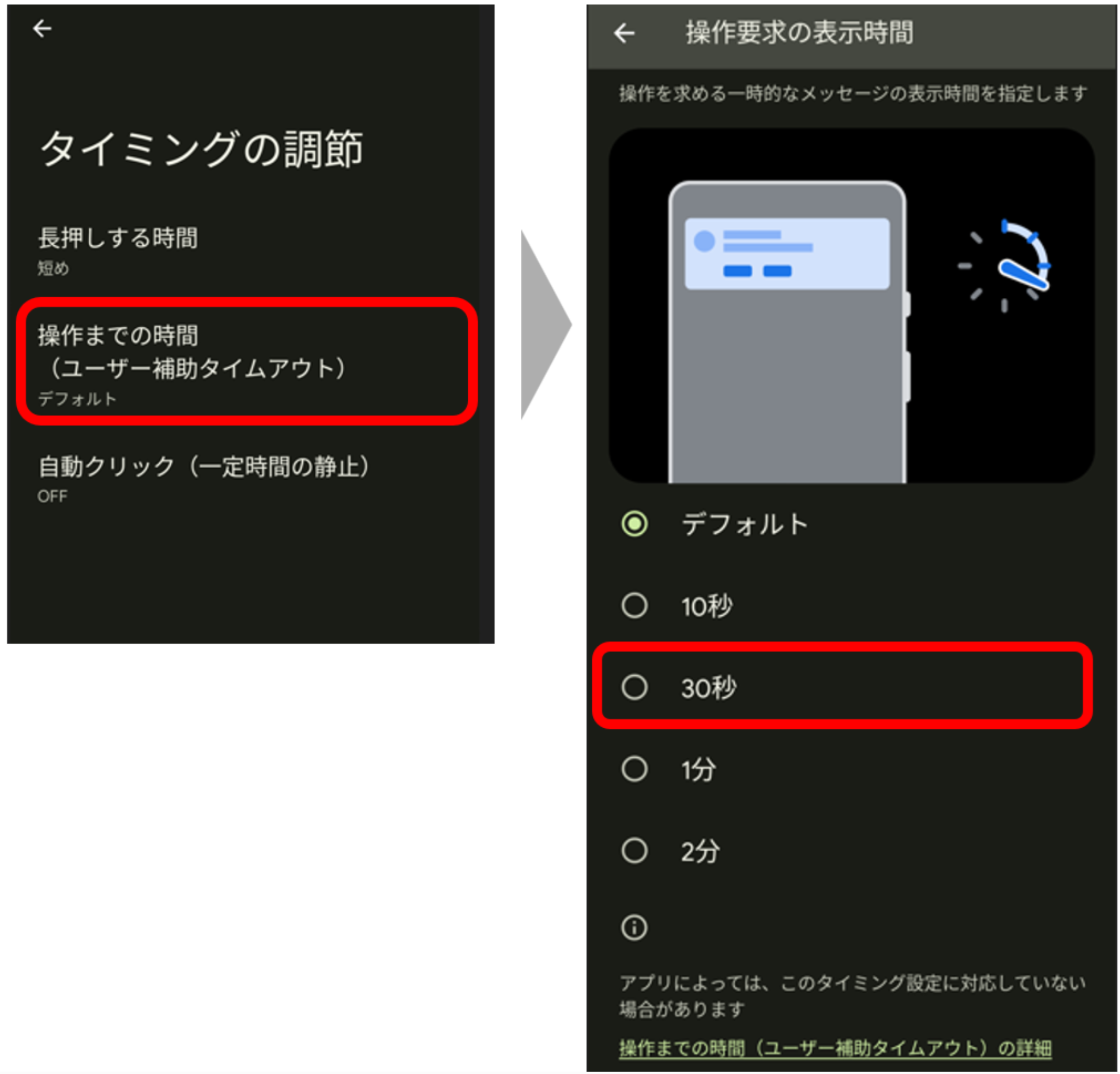 ・Xperia 10 Ⅳ (XQ-DC44)「設定」>「ユーザー補助」>「タイミングの調節」>「操作までの時間(ユーザー補助タイムタウト)」>「30秒」を選択 ・Galaxy M23 5G