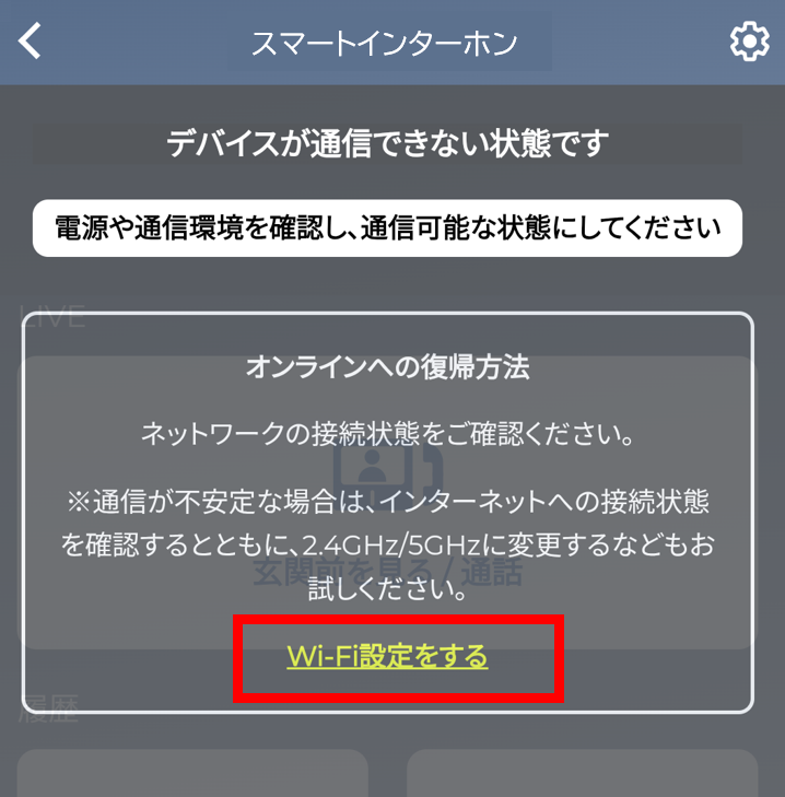 玄関親機のLED状態を確認ください。LEDが赤点滅状態の場合は、インターホンデバイス側がネットワークに接続していないため、 玄関親機の再起動をお試しください。
