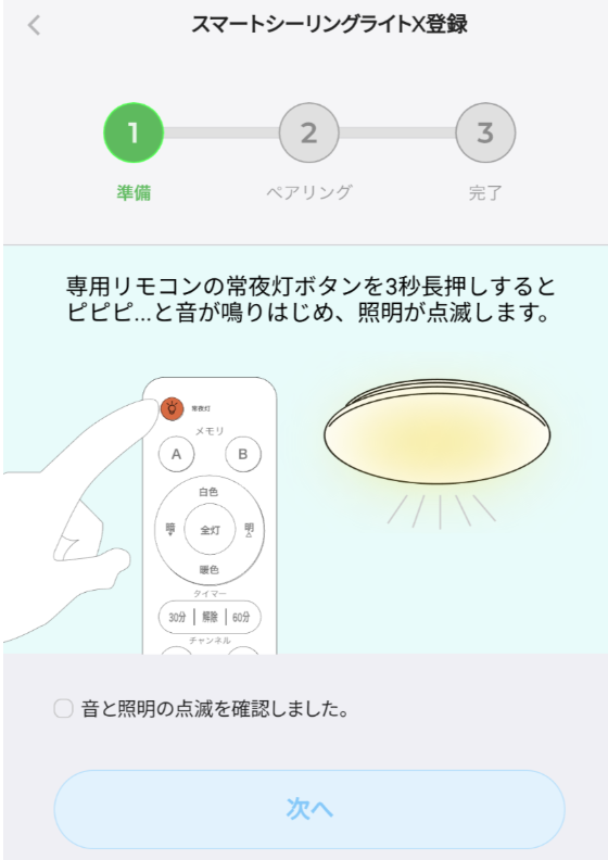 5. アプリ画面に従って、付属リモコンの常夜灯ボタンを3秒間長押ししてください。「ピピピ...」の音が鳴り、照明が点滅状態になったら、アプリの「音と照明の点滅を確認しました」にチェックを入れ、次へ、をタップします。