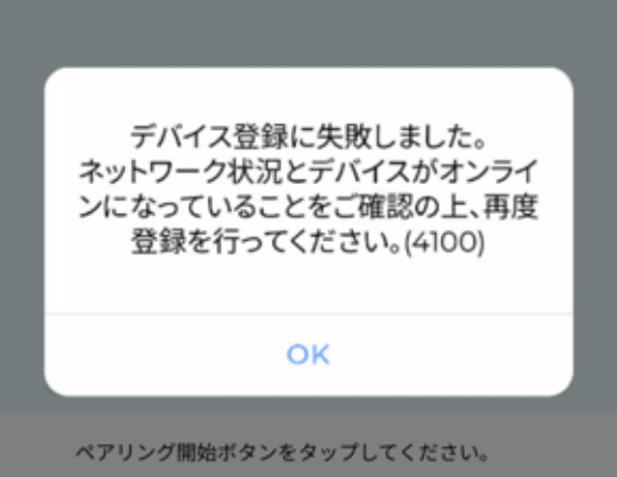※通信不安定等によりタイムエラーが発生した場合、照明本体から「ピー」と音が鳴り、アプリは以下「4100」エラーが表示されます。この場合、「OK」をタップし、手順5からやり直してください。
