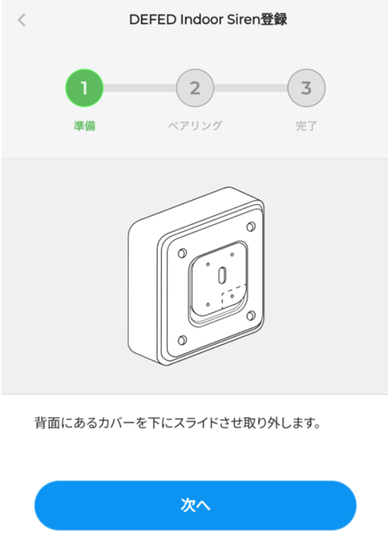 4. アプリ画面の指示に沿って、背面にあるカバーをスライドさせ、本体から取り外し、[次へ]をタップします。