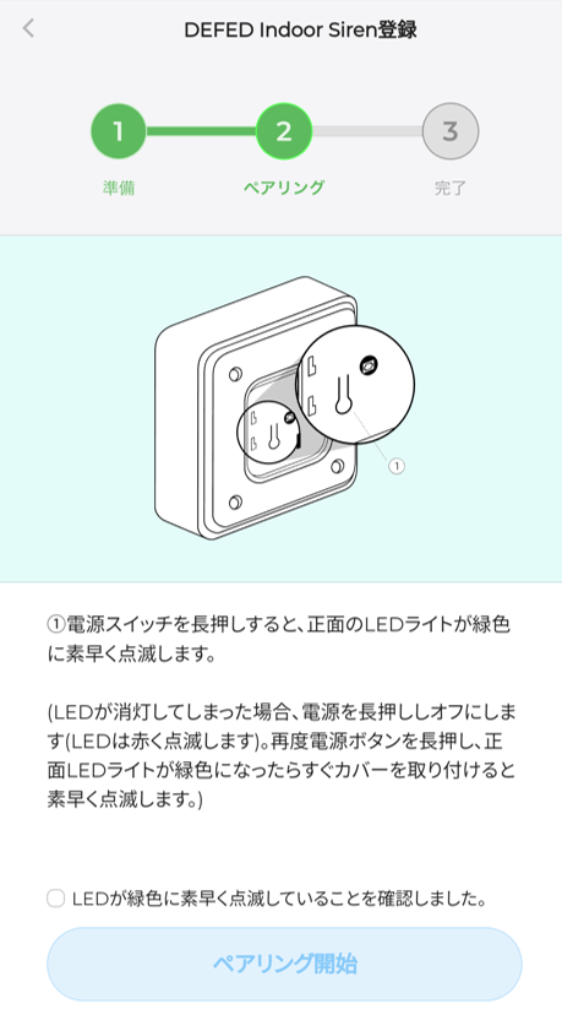 LEDが消灯してしまった場合、電源を3秒以上長押しして一旦OFFにし(LEDが赤く2回点滅します)、再度電源ボタンを1秒以上長押しし、正面LEDライトが緑色になったらすぐカバーを取り付けると素早く点滅しますので[ペアリング開始]を押してください。