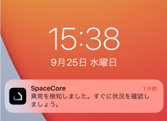 異常を検知すると、家ではサイレンが鳴り、スマートフォンにはプッシュ通知が来ます。異常検知中にアプリを立ち上げると、[セキュリティ]パネルは赤く表示されます。
