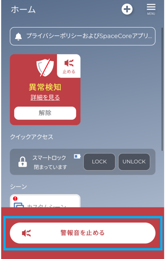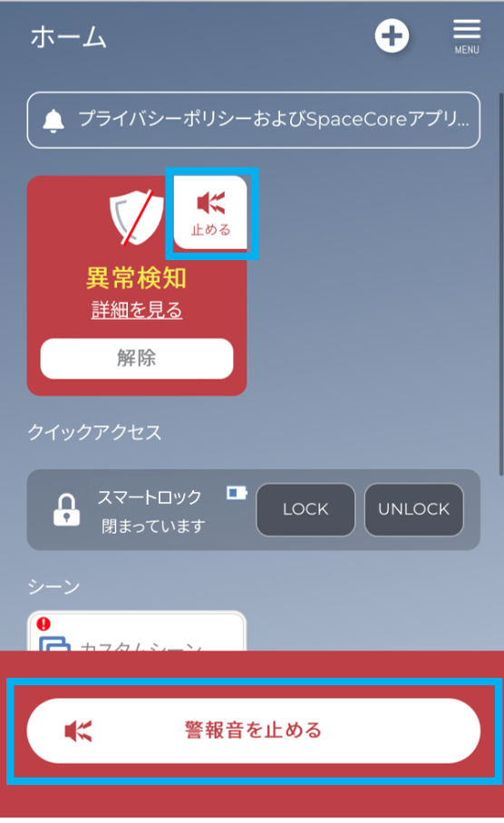 ①セキュリティパネルの[止める]ボタン、もしくは画面下部に表示されている[警報音を止める]タップすると、サイレンを停止することが出来ます。