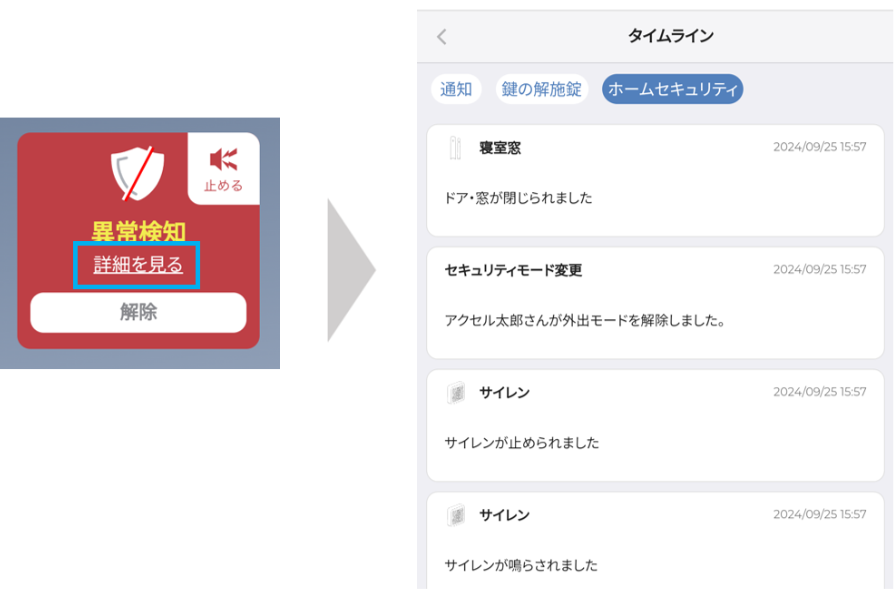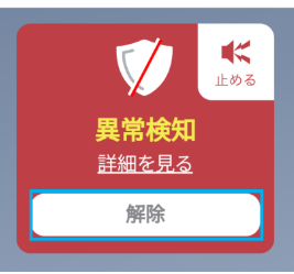 [解除]ボタンをタップし、ポップアップで、[解除]をタップすると、セキュリティ状態を解除することができます。セキュリティ状態を解除すると、サイレンの鳴動も停止します。
