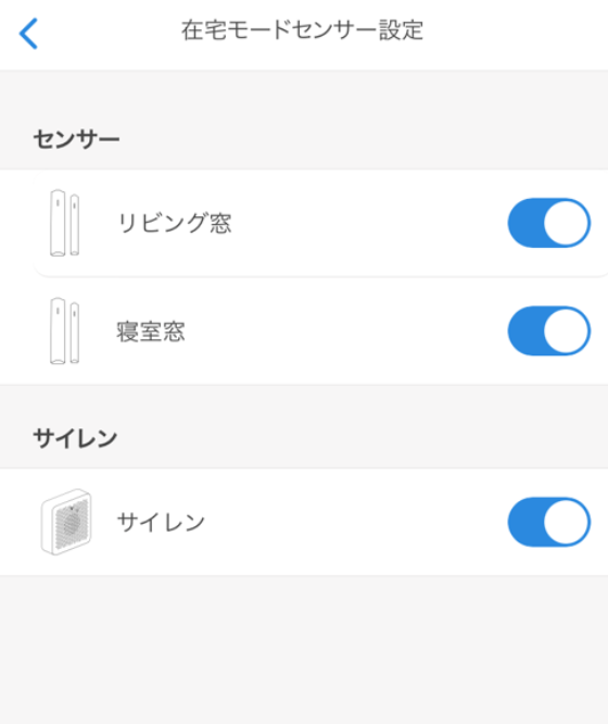 4.設置しているドア窓センサー・サイレンデバイスの一覧が表示されるので、在宅時に異常検出に使用するデバイスをON(青)、使用しないデバイスをOFF(グレー)にします。