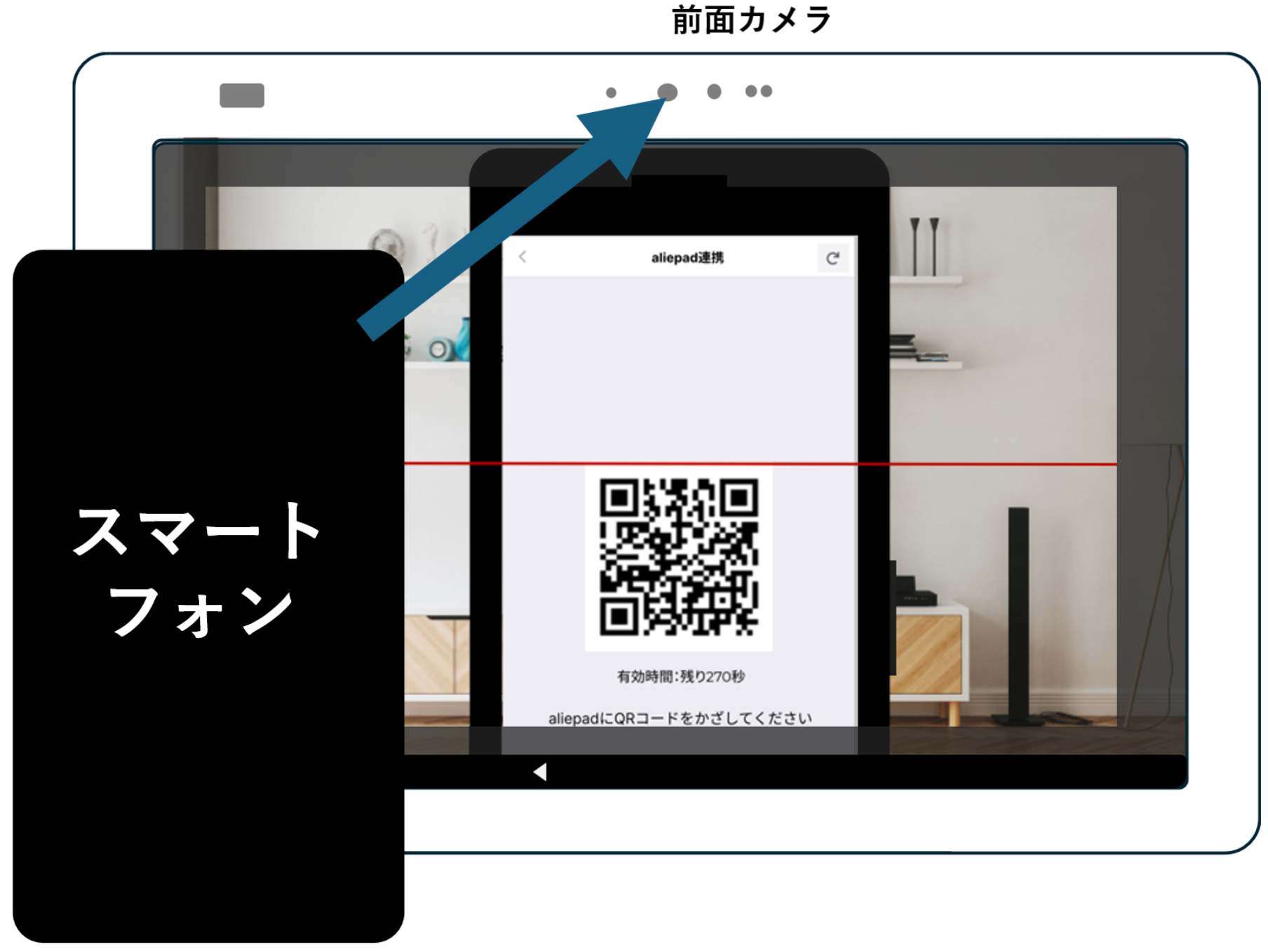 ③前面カメラが起動されますので、スマートフォンをaliepadの前面カメラに近付け、手順①でアプリに表示させたQRコードを読み取らせてください。