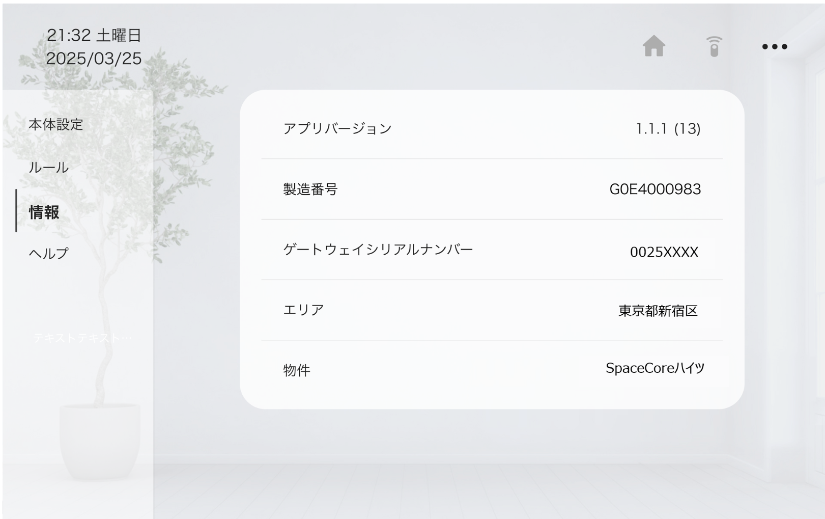 aliepadのアプリバージョン、製造番号、ゲートウェイシリアルナンバー、エリア、物件が表示されます。