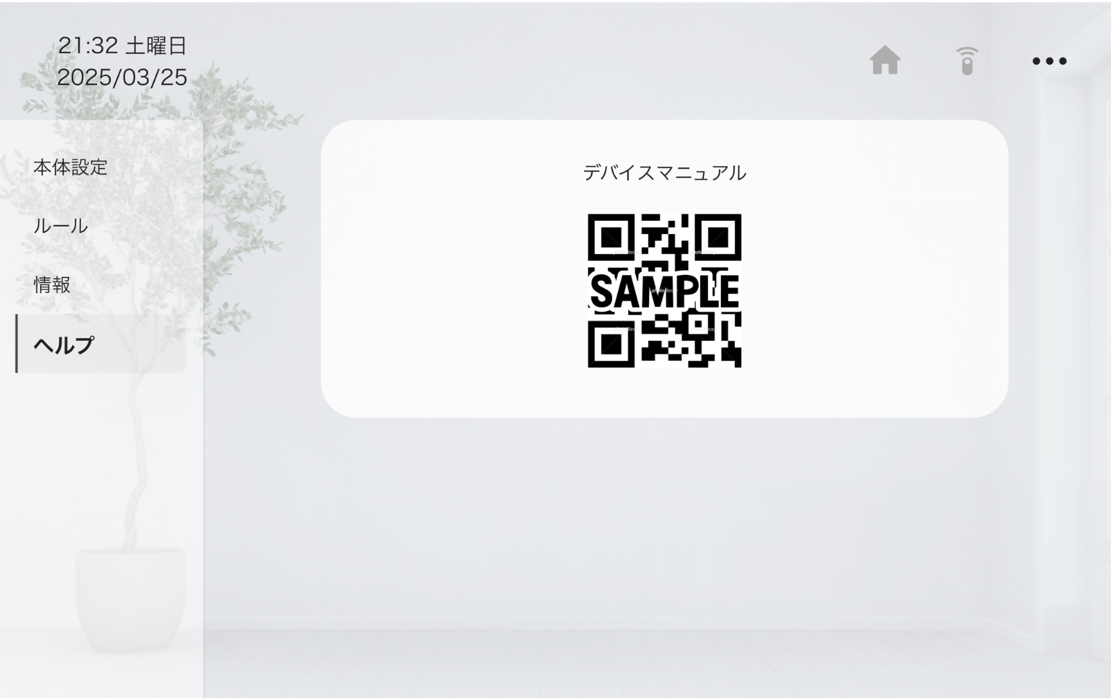 ホーム画面右上のメニュー「…」ボタンをタップすると、端末の設定画面が表示されます。