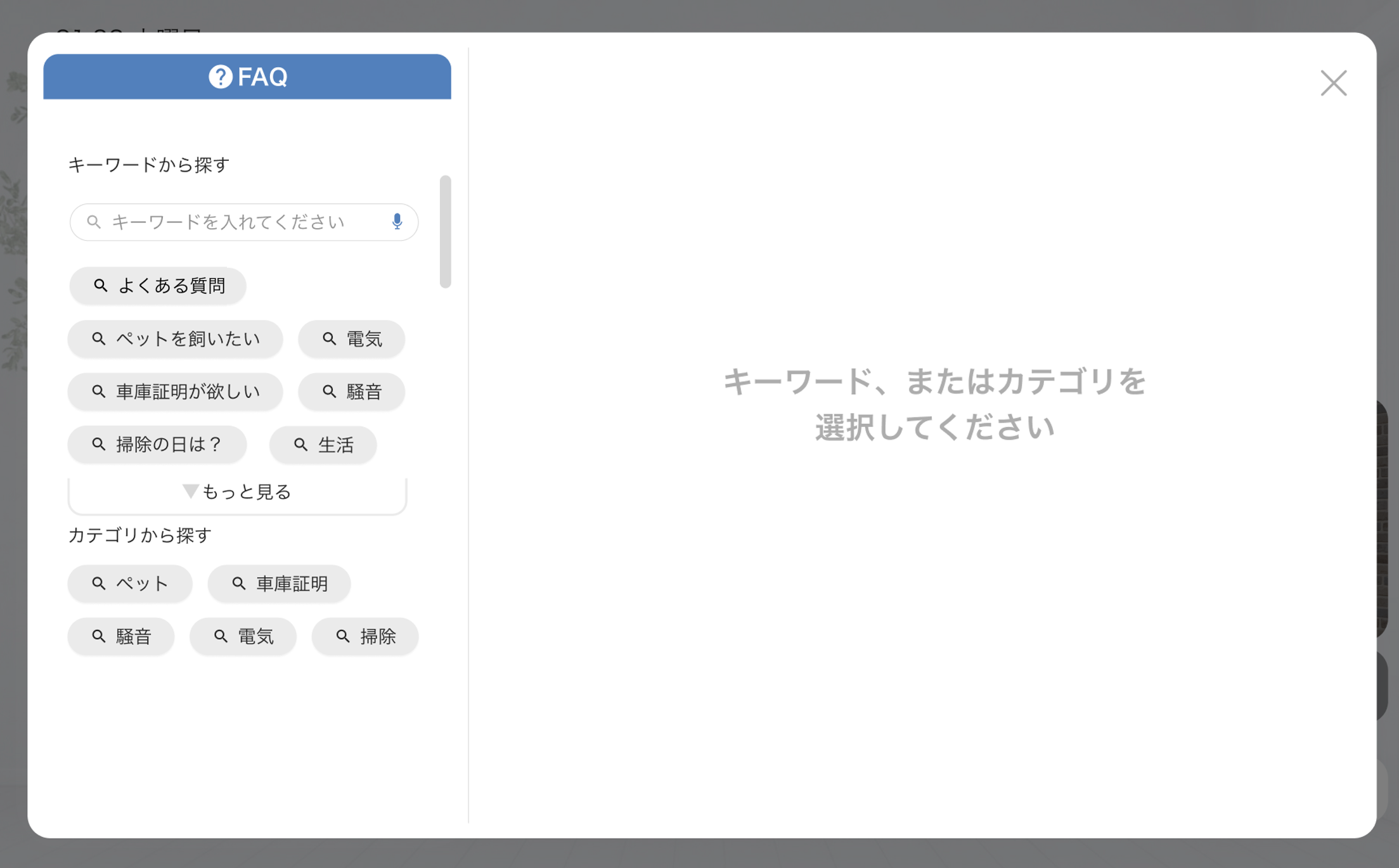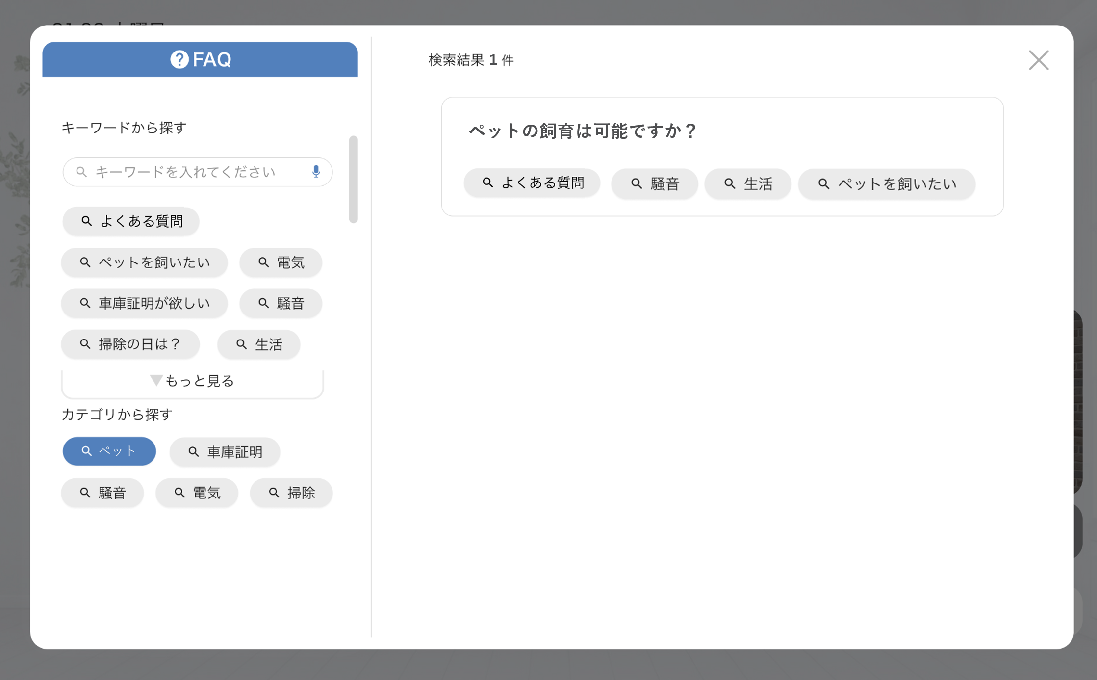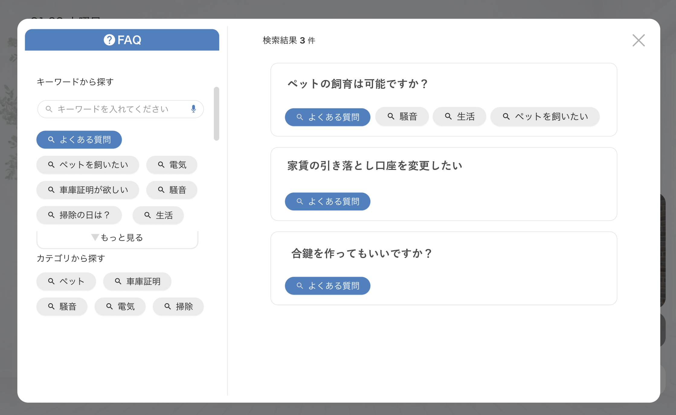 表示されているキーワードをタップしたり、テキストを入力することで、そのキーワードが登録されているFAQを確認することができます。