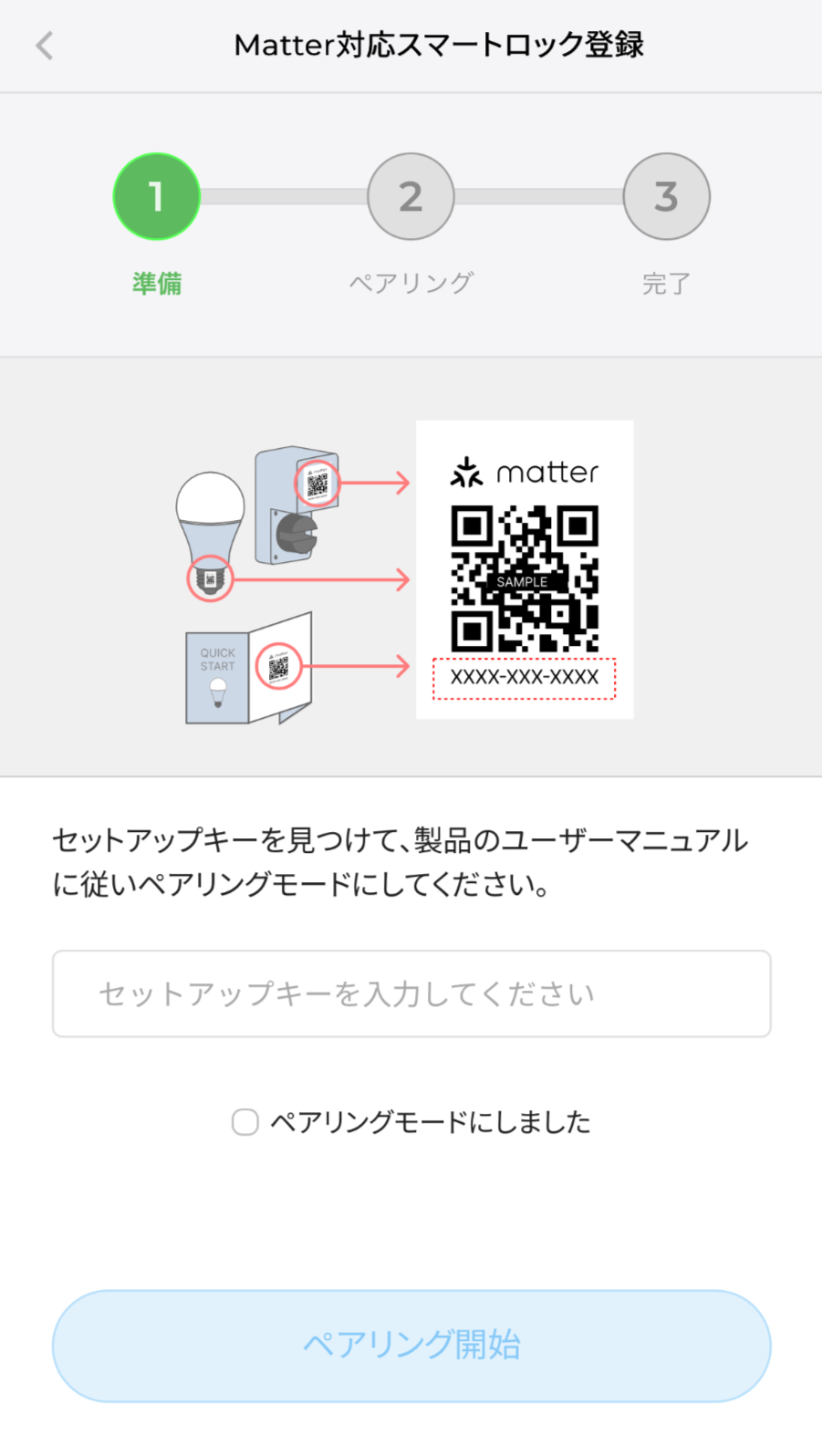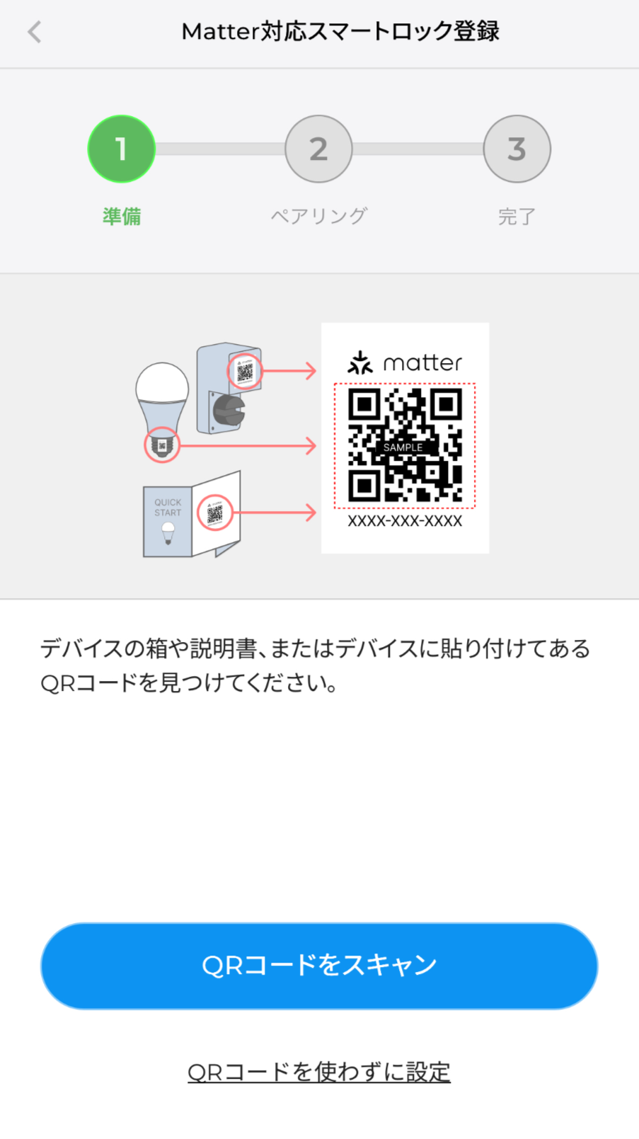 4.ペアリングしたい対象のMatter対応スマートロックの本体や、外箱、添付物等に、MatterマークのQRコードのシールが貼付されていましたら、SpaceCoreアプリの以下画面にて、「QRコードをスキャン」をタップし、QRコードを読み取ってください。※操作中のスマートフォン端末より「カメラ撮影をSpaceCoreに許可しますか」の画面が表されましたら、許可をおねがいいたします。MatterマークのQRコードが見当たらない、読み込めない場合には、Matterのセットアップキーを手入力いただくことも可能です。この場合、「QRコードを使わずに設定」をタップし、以下画面にてセットアップキーを入力します。