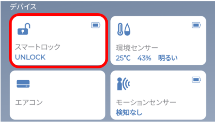 ・デバイスエリアからの操作スマートホーム画面のデバイス操作に表示されたスマートロックのパネルにて、施錠・解錠状態を確認することができます。スマートロックのパネルをタップしてパネル詳細画面を開くと、解錠・施錠の操作を行うことができます。