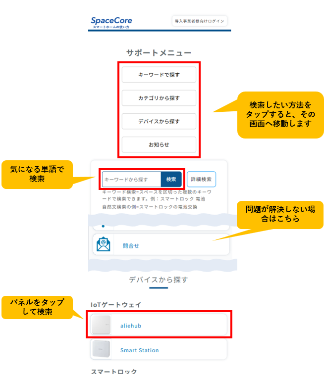 検索窓でキーワードを入力して検索、パネルのタップなどの方法で検索することができます。問題が解決しない場合は、「お問い合わせ」のパネルをタップし、お問い合わせフォームからお問い合わせください。
