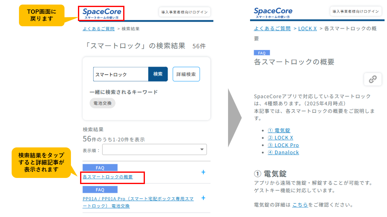 検索結果の一覧で、タイトルをタップすると、詳細内容を参照することができます。TOP画面に戻る場合は、左上のSpaceCoreのロゴをタップしてください。